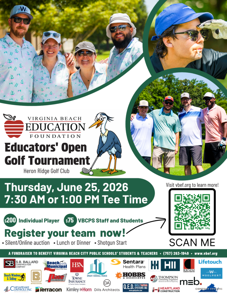 The 32nd annual Educators’ Open will be held at Heron Ridge Golf Club on Thursday, June 25, 2026. The event includes lunch and dinner, practice range balls, gift bags, team and player prizes, and snacks and beverages throughout the day.